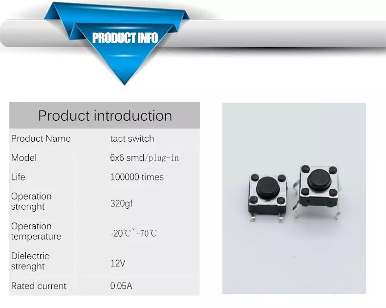 Tact switch size: 6.0 x 6.0 (mm) Height (mm) : 4.3, 5.0, 5.5, 6.0, 6.5, 7.0, 7.5, 8.0, 8.5, 9.0, 9.5, 10, 10.5, 11, 11.5, 12, 12.5, 13, 13.5, 14, 15.